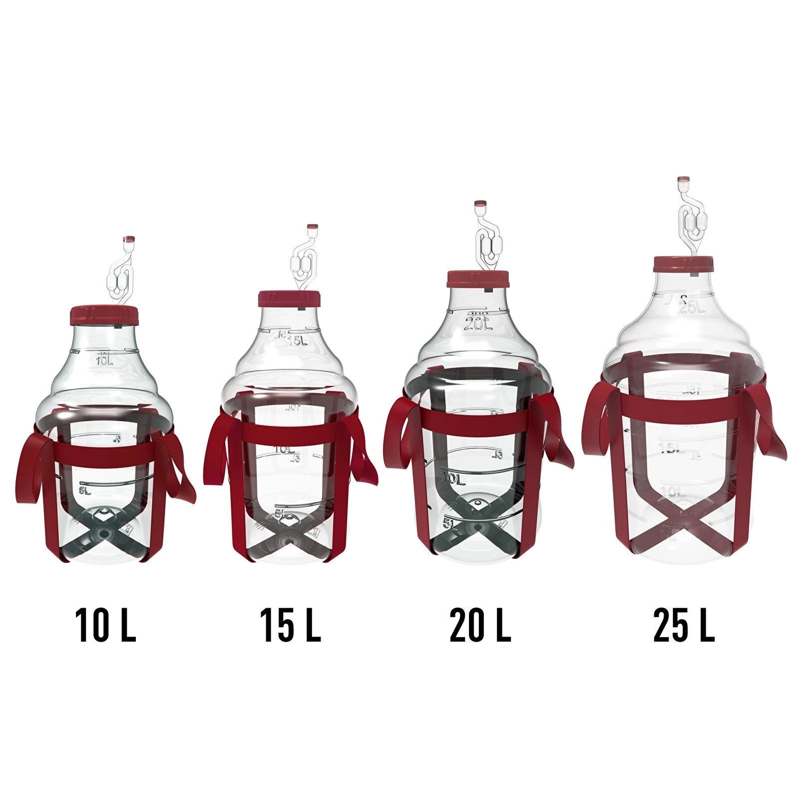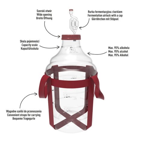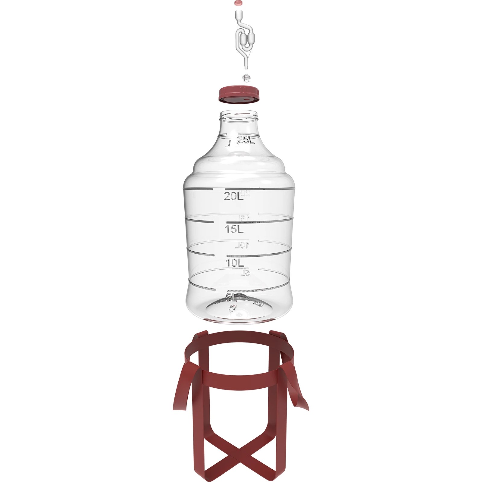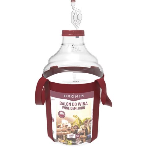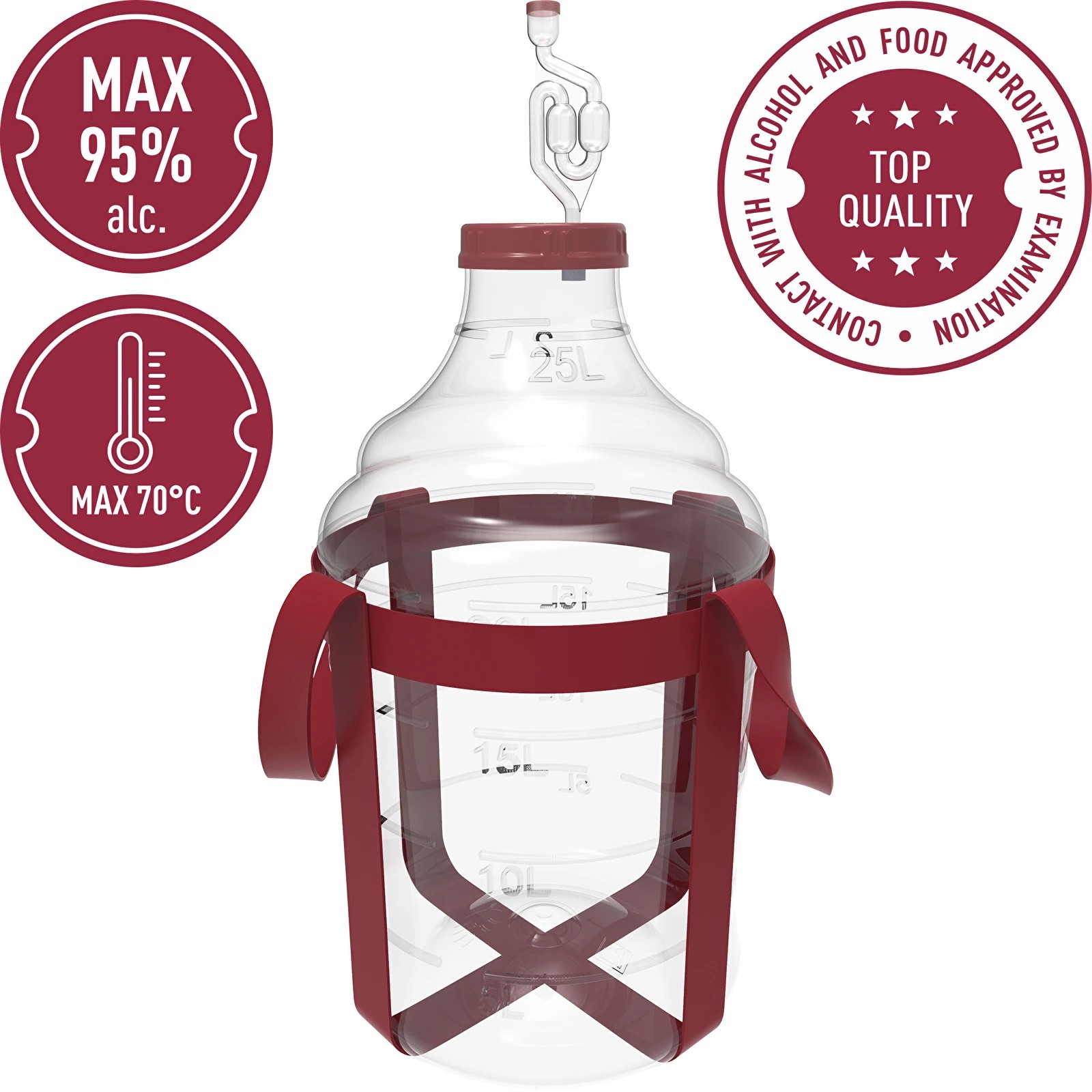 Plastmasas vīna pudeles tilpums ir 25L. Plastmasas pudele ir labs stikla pudeļu aizstājējs, jo tā ir drošāka. Pudelei ir speciāla uzkabe, kas ļauj ērti un droši pacelt pilnu pudeli. Pudelei ir vāciņš ar caurumu hidroaizvaram. Hidroaizvars ir komplektā. Pudelei ir skala, kas ļauj viegli izmērīt un pārbaudīt šķidruma daudzumu. Pirms lietošanas nomazgāt. 1 gab.