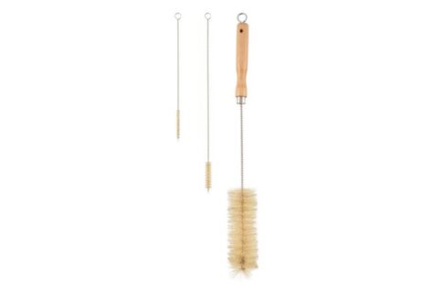 Trīs dažādu izmēru pudeļu tīrīšanas birstes. Birstēm ir koka rokturi, elastīgas vārpstas un dabīgi sari.